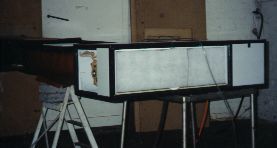 (10) Noise testing a prototype fan-coil unit in a semi-reverberation room. This particular setup shows additional filter media attached to the air inlet to simulate required operating pressure drop, while the actual test being performed is an in-duct discharge noise test with the microphone inside the duct on the left. This was a non-NATA test for preliminary evaluation of a prototype with only a few days turnaround from when the equipment arrived for testing to the final report delivery. |